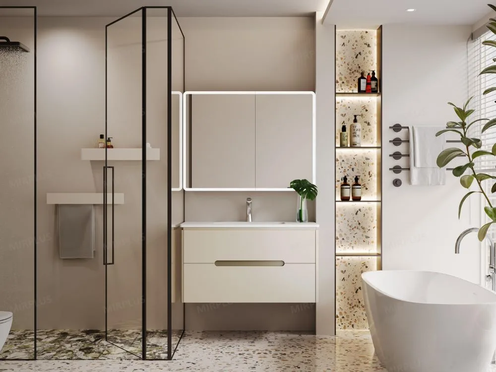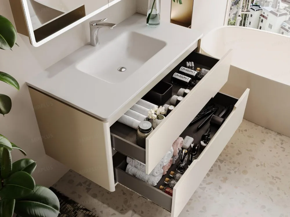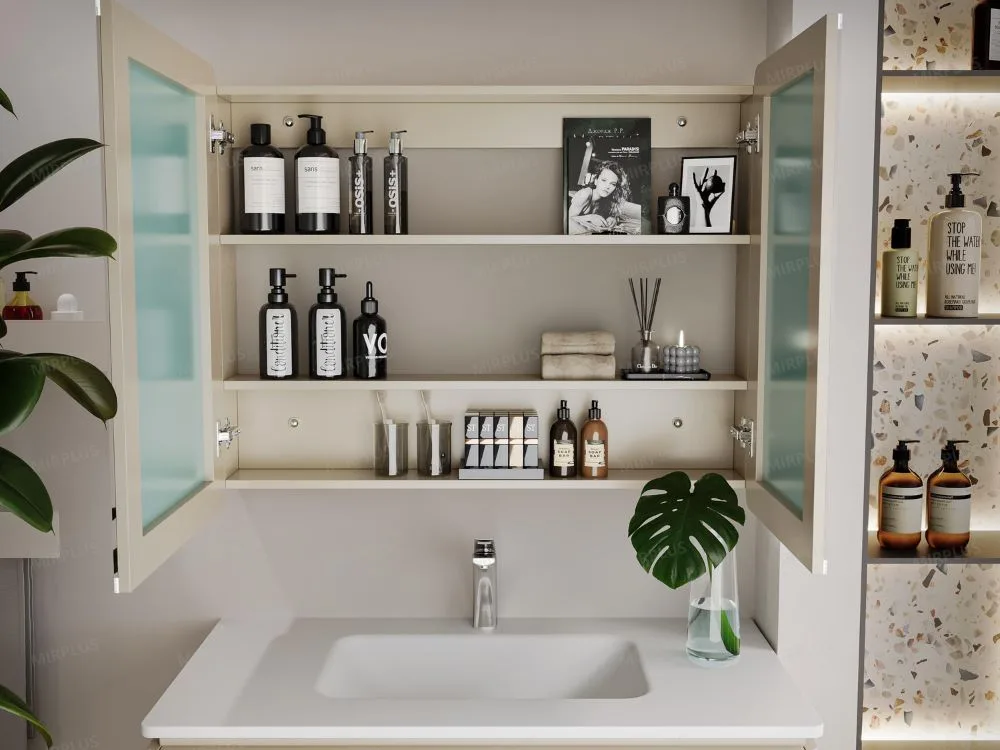 • [Lower Storage (Base Cabinet)]: Engineered with moisture-resistant materials, featuring soft-close hinges and spacious drawers to conceal towels, cleaning supplies, and larger essentials.